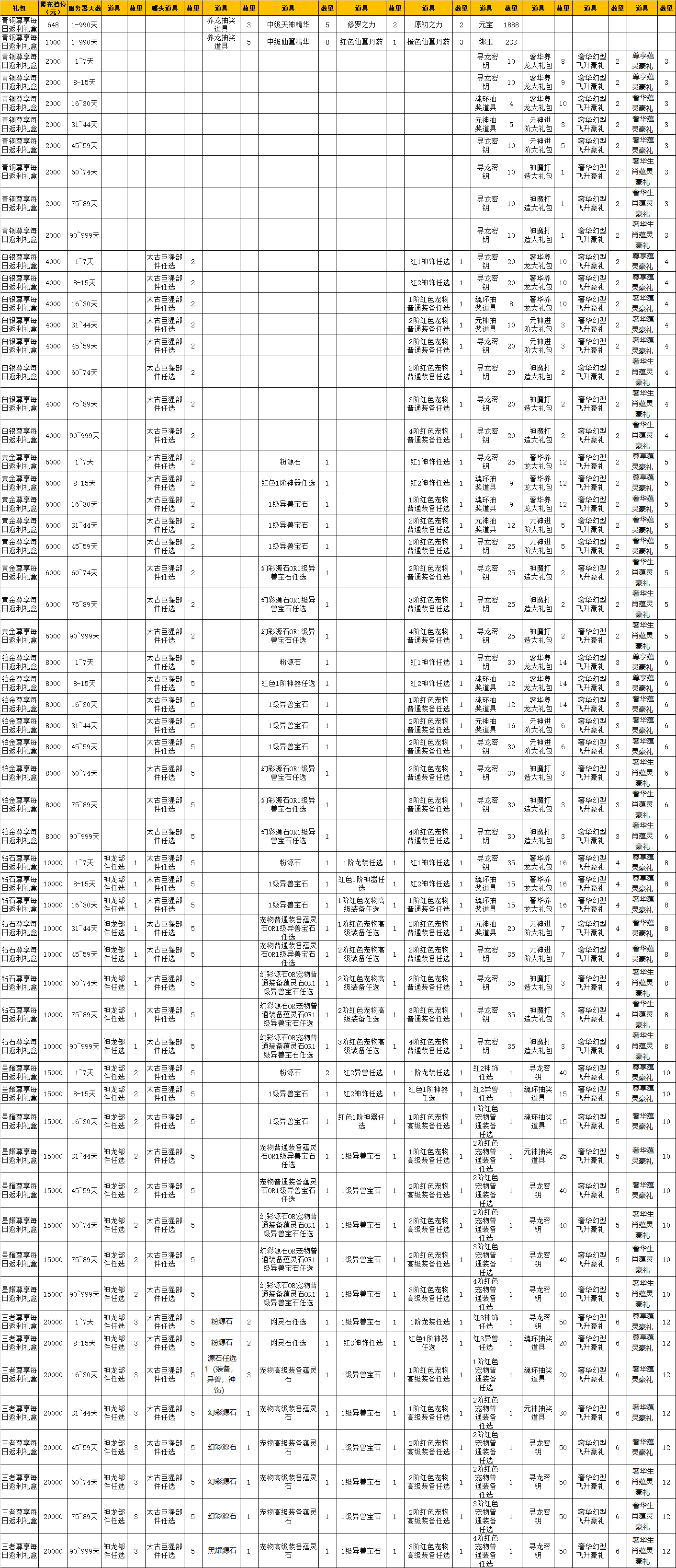 10000:宠物觉醒技能卷轴*1 寻龙密钥【绑】【红】【1星】*20 30455001(火箭)*1 玲珑宝玉【绑】【橙】【1星】*3 金柳仙露【绑】【紫】【1星】*150